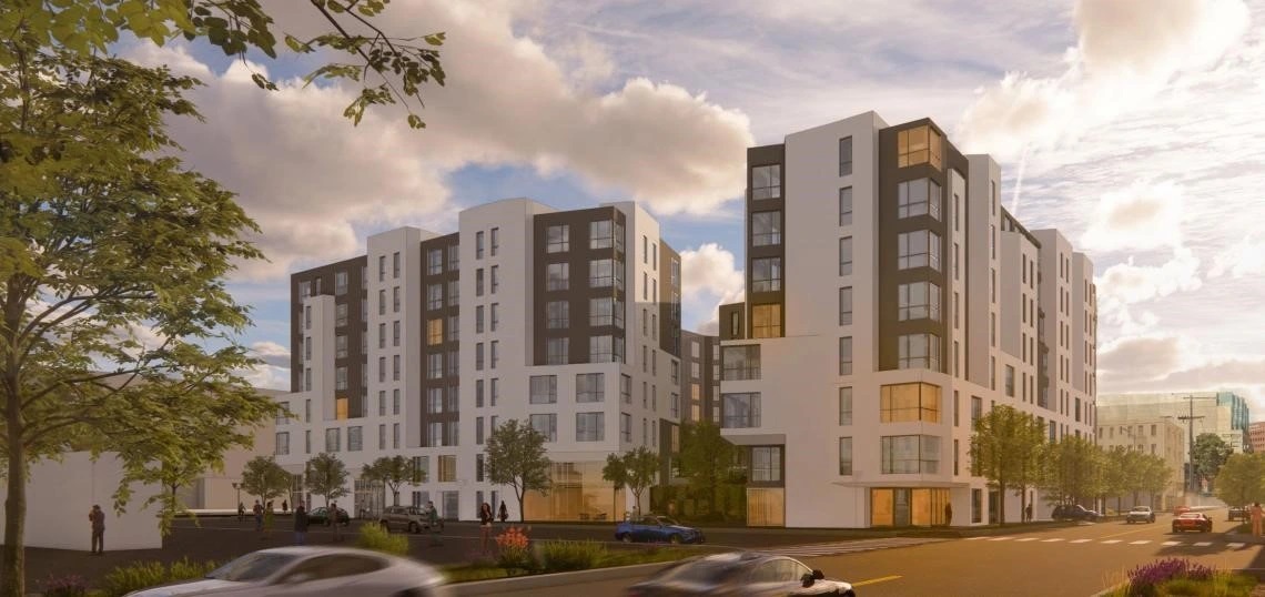 Steinberg Hart is designing the apartment complex, which would consist of eight-story buildings and a new pocket park facing Hill Street to the west.